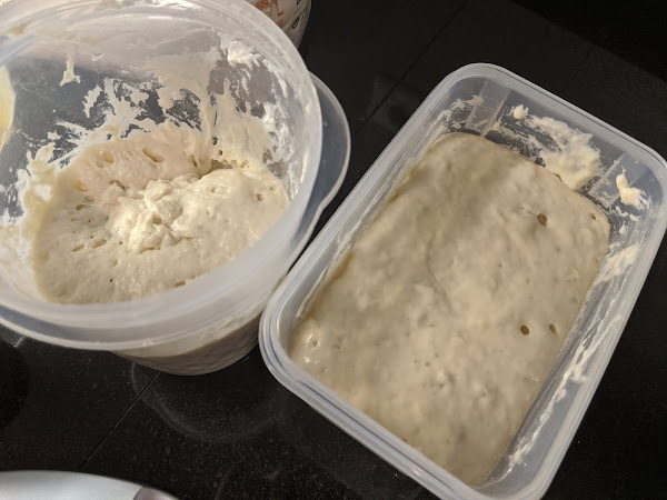 Ponemos la masa en un túper y dejamos que arranque el levado. A 20 grados ha tardado 2 horas y 45 minutos. Guardamos bien cerrado en la nevera durante 25 horas en mi caso aunque con menos hubiera válido (logística pura y que mi mm no estaba plenamente activa)