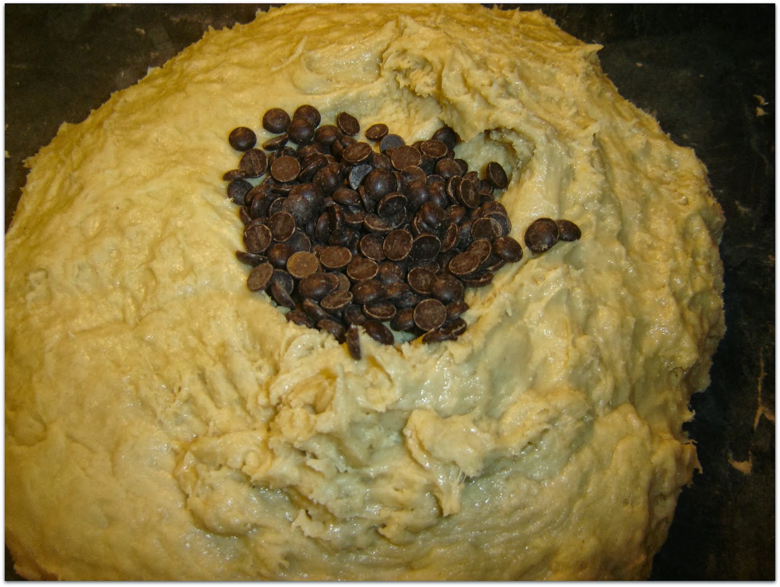 La masa es pegajosa, no os asustéis. Manejadla con harina en las manos para que os sea más fácil. Una vez bien integrados todos los ingredientes, agregamos las pepitas de chocolate y continuamos amasando.