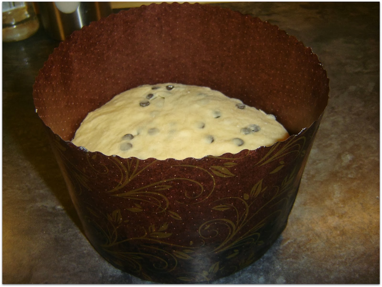 Dejamos levar hasta que doble el volumen. En mi caso, tenía un molde de panettone, pero sino lo tenéis, os recomiendo que uséis un molde circular y le pongáis papel de horno en forma de cilindro para que suba alto la masa al levar.