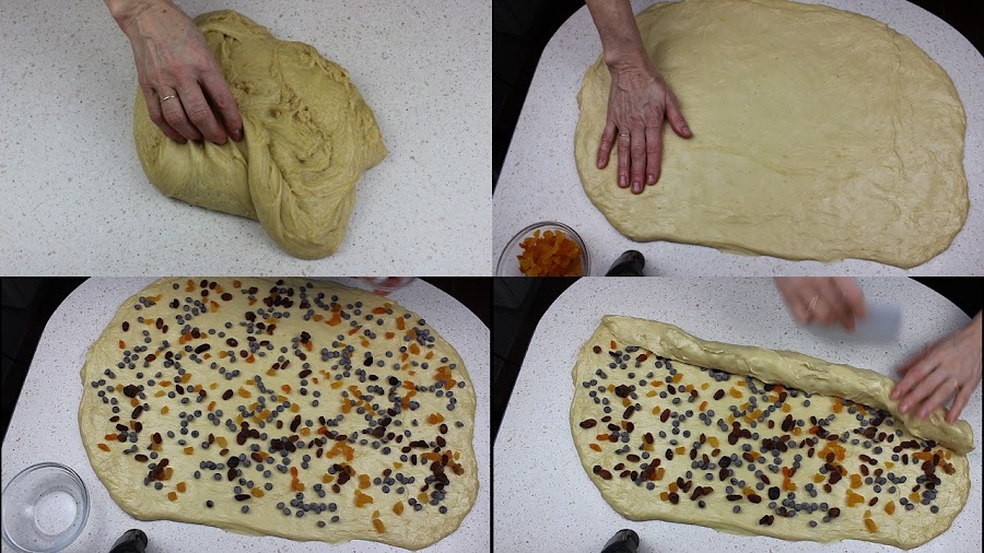 Una vez que ha levado , la sacamos , amasamos un poquito a mano para desgasificarla, si se pega en las manos, las untamos con aceite de girasol para manejarla mejor y la extendemos con las manos formando un rectángulo y colocamos el relleno encima, envolvemos el relleno enrollándolo y formamos una bola.