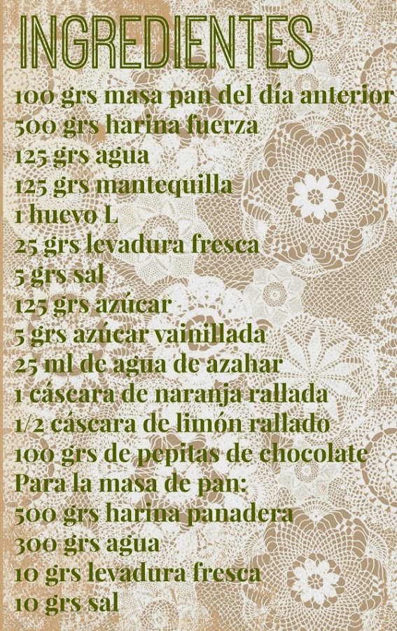 Una vez que tenemos este prefermento de masa de pan comenzamos la elaboración del panettone. Para ello ponemos en un bol todos los ingredientes de la receta excepto el huevo batido y las pepitas de chocolate, mezclamos y volcamos sobre la mesa ligeramente embadurnada (si, he dicho ligeramente, solo es para que no se nos pegue la masa a la mesa) con mantequilla. Durante 15 minutos hacemos este proceso (5 minutos de amasado y 5 minutos de reposo; es decir 3 veces seguidas). Extendemos la masa en forma de rectángulo y ponemos las pepitas de chocolate. Yo he utilizado 100 grs de pepitas de chocolate blanco y 6 caramelos de toffee (de los blanditos)partidos en trocitos. Doblamos la masa a la mitad para introducir los tropezones en la masa y boleamos, para darle la forma redondita. Ponemos la masa en un bol ligeramente aceitado y tapamos con un film transparente también aceitado. Dejamos reposar 24 horas en la nevera.