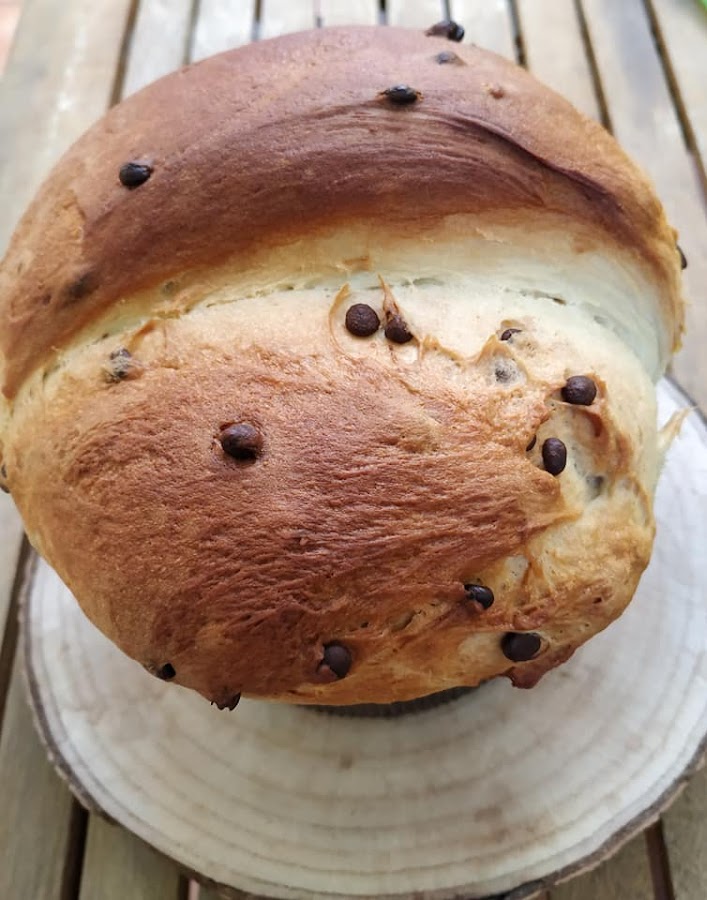 Precalentamos el horno a 180º con calor arriba y abajo, pintamos el panettone (con sirope de agave o margarina vegetal derretida)