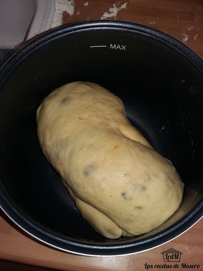 Dejamos en la cubeta hasta que aumente de volumen y llegue al borde del molde, no lo dejéis más tiempo porque puede rebosar y al hornearlo salirse del molde. Hacemos un corte en forma de cruz y le ponemos un trocito de mantequilla, pintamos con huevo batido y horneamos a 180ºC en horno precalentado durante unos 40 minutos. Yo lo tuve que hornear no a altura media, sino una por debajo, no sé si me explico... y lo tuve que tapar con papel de aluminio a los 15 minutos de horneado porque se estaba tostando más de la cuenta, pero como siempre os digo, cada horno es un mundo.