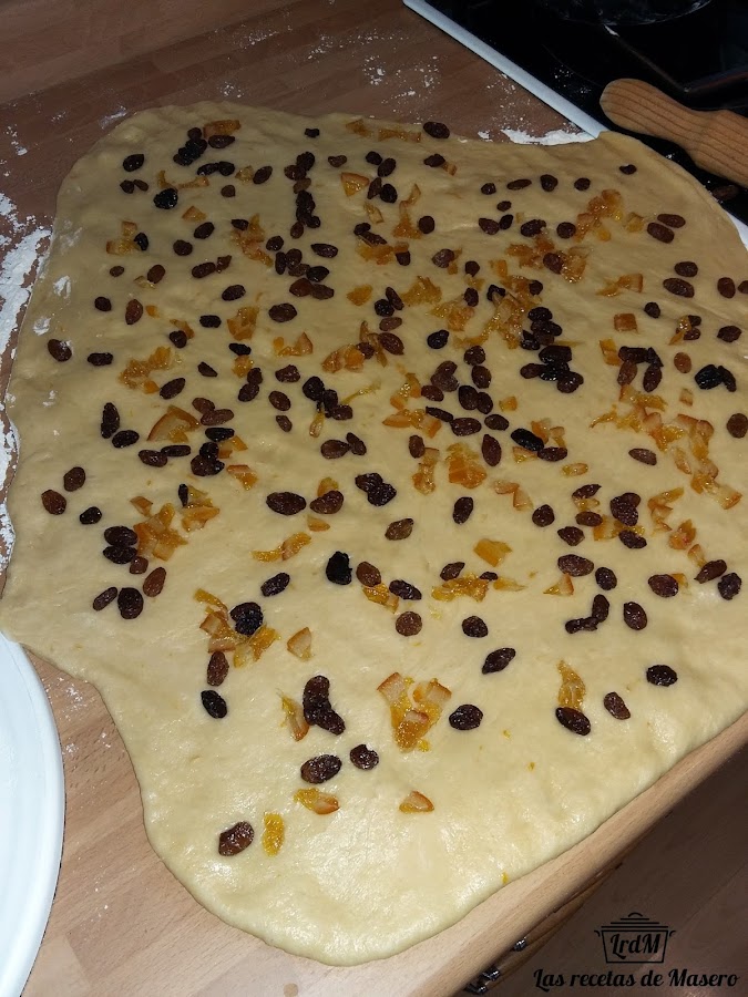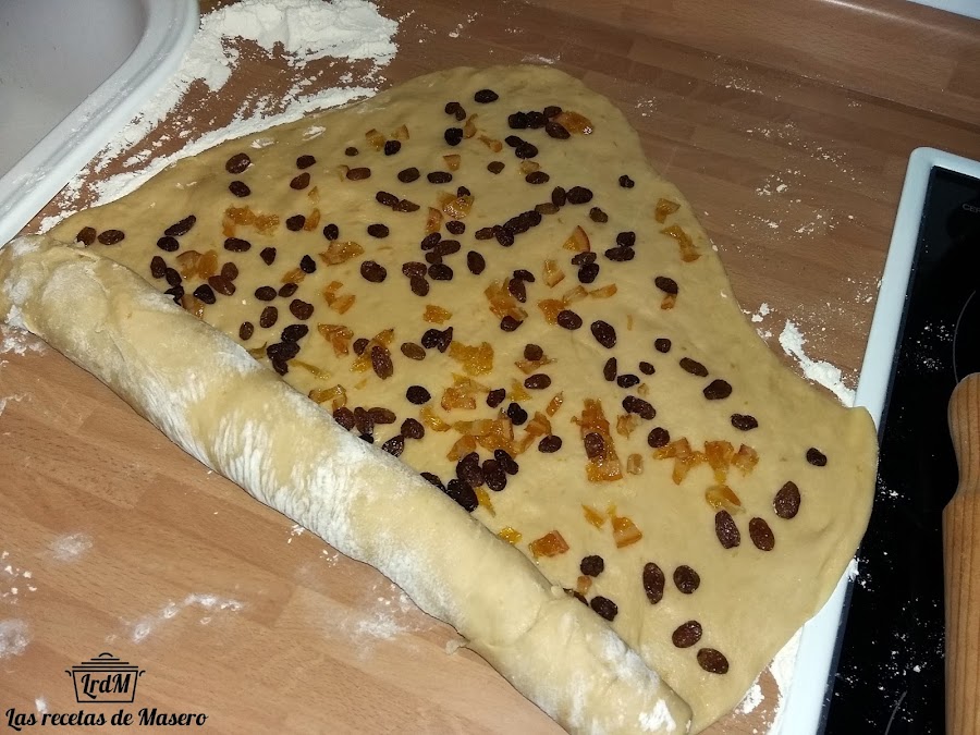 Una vez que la masa ha levado, ponemos sobre una superficie enharinada y la estiramos con un rodillo. Colocamos el relleno por toda la superficie como se ve en la fotografía.