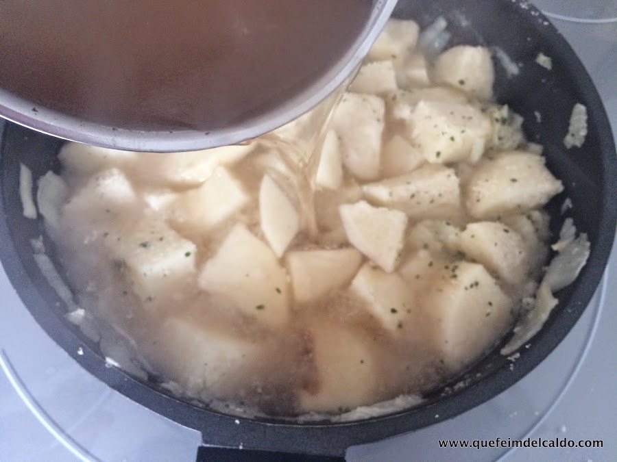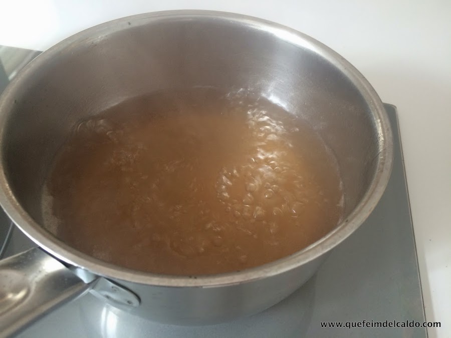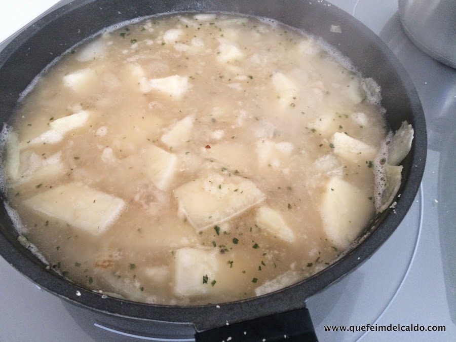 Una vez haya reducido el vino incorporamos el caldo de pescado a la sartén.