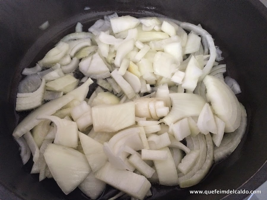 En primer lugar pelamos y cortamos la cebolla, ponemos en una sartén 3 cucharadas soperas de aceite de oliva, lo calentamos a máxima potencia y ponemos la cebolla a pochar, una vez puesta la cebolla, disminuimos la potencia del fuego a la mitad, dejamos pechándose entre 15 y 20 minutos removiendo de vez en cuando.