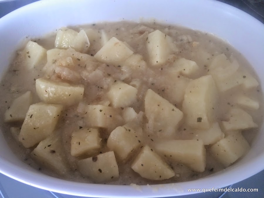 Una vez haya transcurrido el tiempo y el caldo haya espesado lo suficiente, ponemos en una fuente horno el guiso que hemos hecho con las patatas.