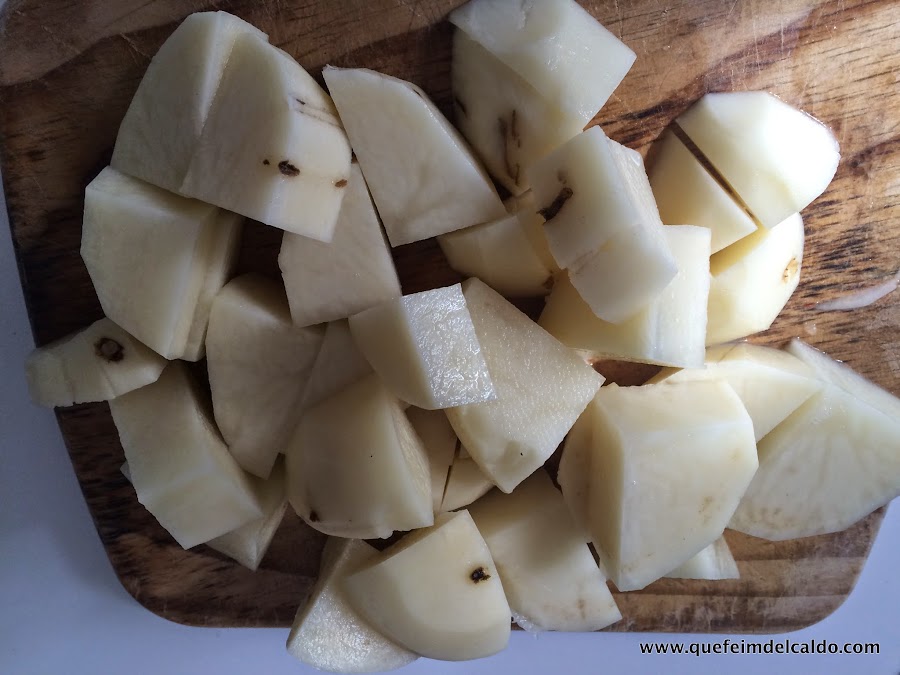Cogemos dos patatas grandes, yo las compro de muy buena calidad, por qué aunque cuesten un poco más caras la diferencia en textura y en sabor es muy grande, las pelamos, las lavamos y las cortamos en trozos de aproximadamente 3 cm.
