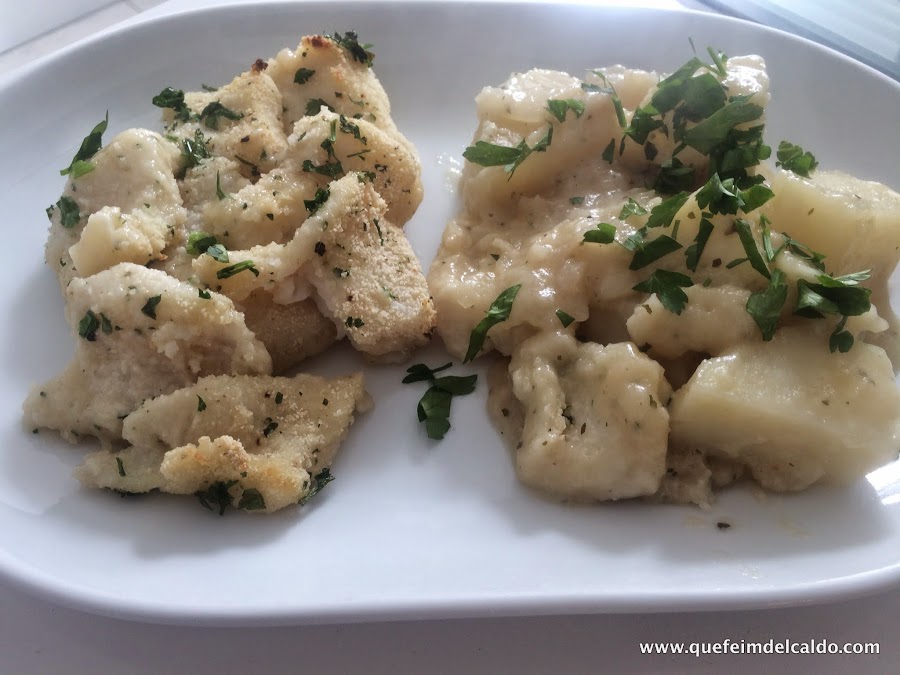 Lo he cocinado a la menorquina es decir, lo he rebozado con pan rallado y ajo, y lo he puesto sobre un guiso de patatas (también rebozadas) y cebolla pochadas como a mí me gusta, muy poco a poco.
