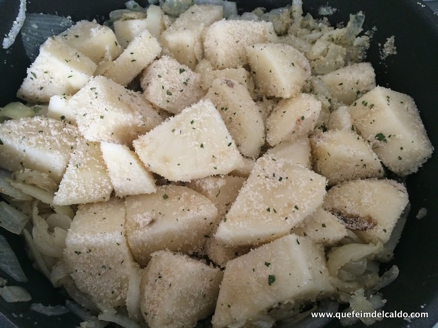 Transcurridos los 20 minutos que hemos la cebolla pochando añadimos las patatas a la sartén.