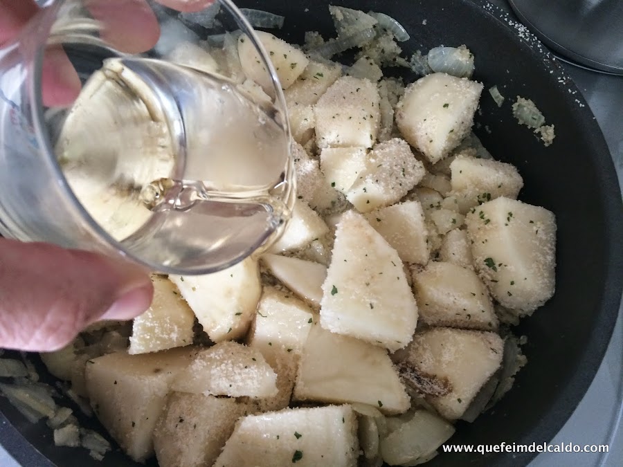 Acto seguido incorporamos los 100 ml. de vino blanco y damos máxima potencia para que evapore pronto el alcohol y la acidez del vino.