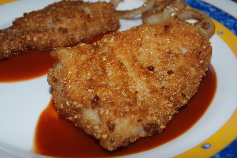 Mezclamos el pan rallado, el sésamo y los copos de puré de patatas. Cortamos el pescado en porciones medianas y las pasamos por harina, huevo y la mezcla de pan rallado. Freímos en aceite bien caliente hasta que estén dorados y los colocamos sobre papel absorbente.