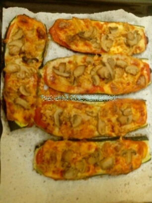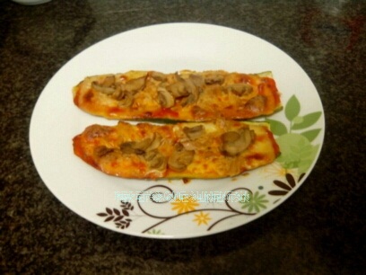 Dos barras de pan, 2 berenjenas, 150 gr de queso Mozzarella, 200 gr de champiñones en conserva, 200 gr de salsa de tomate, hojas de albahaca fresca, pimienta negra molida, aceite de oliva, sal.