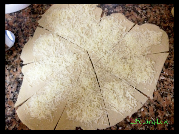 Cortar en triangulos y enrollar desde la parte mas ancha del triangulo hasta la punta, Disponer en una bandeja y pincelar con el huevo batido.