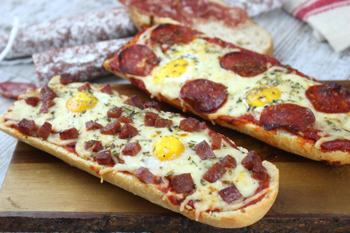 Una original y crujiente pizza en barra de pan, con fuet, chorizo y huevos de codorniz.