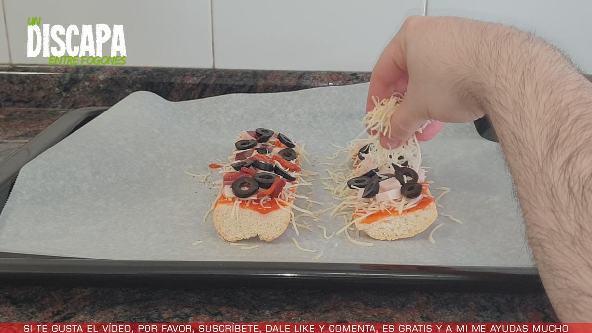 2Y ahora vamos a colocar los ingredientes encima del pan. Empezamos añadiendo un poco de salsa de tomate, lo extendemos bien por todo el pan, le ponemos orégano por encima del tomate, después ponemos queso rallado, y ahora a uno de ellos le voy a poner unos trocitos de fiambre de pavo y al otro le voy a poner unos trocitos de bacón, ahora cortamos unas rodajas de aceituna negra y se lo añadimos por encima a los dos paninis, y por último, añadimos un poco más de queso rallado por encima.