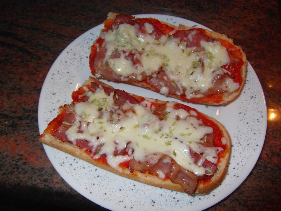 Bueno yo cogí un trozo de chapata y lo abrí por la mitad, le unte una generosa capa de tomate frito, si es casero mucho mejor. Mientras tanto pase el bacon por la sartén para que cogiera algo de color y una vez tostado se coloqué encima al pan, añadí la mozzarella y lo metí en el horno a gratinar hasta que se derritió el queso. Luego espolvoree el orégano y listo para comer.
