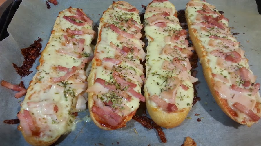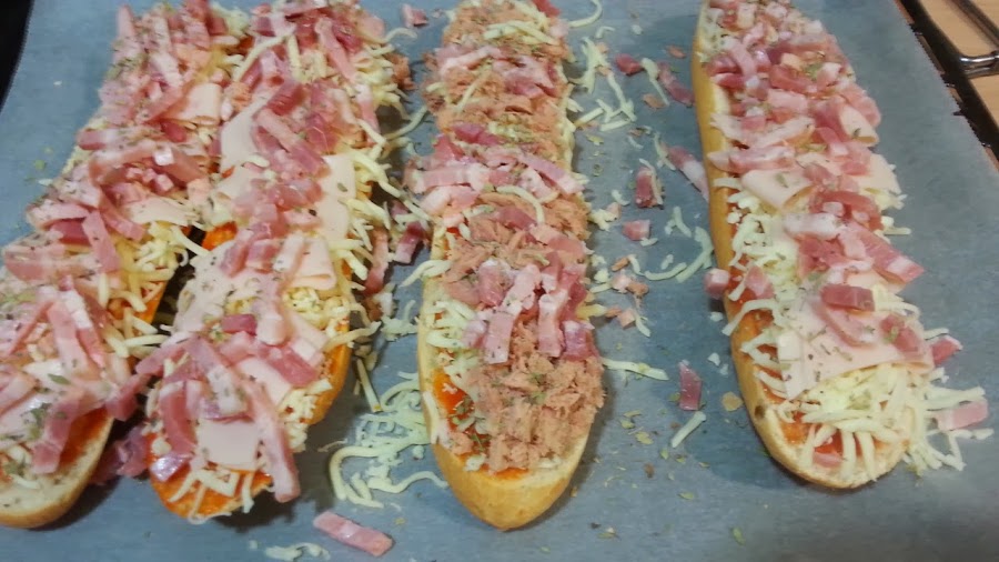 Ingredientes para dos: 2 baguettes de las pequeñas, de racion individual 1 paquete de mozzarela rayada 5 lonchas de jamon york un paquete de tiras de bacon 1 lata de atun tomate frito oregano