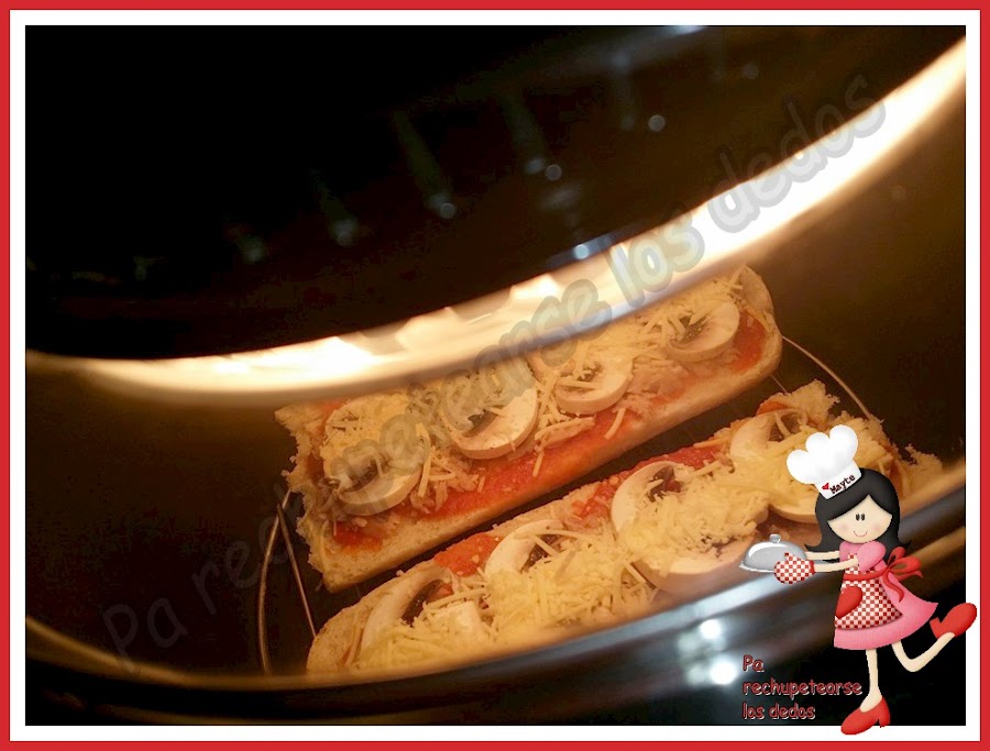 - Pon sobre las porciones un poco de tomate frito, atún, champiñones y queso rallado.