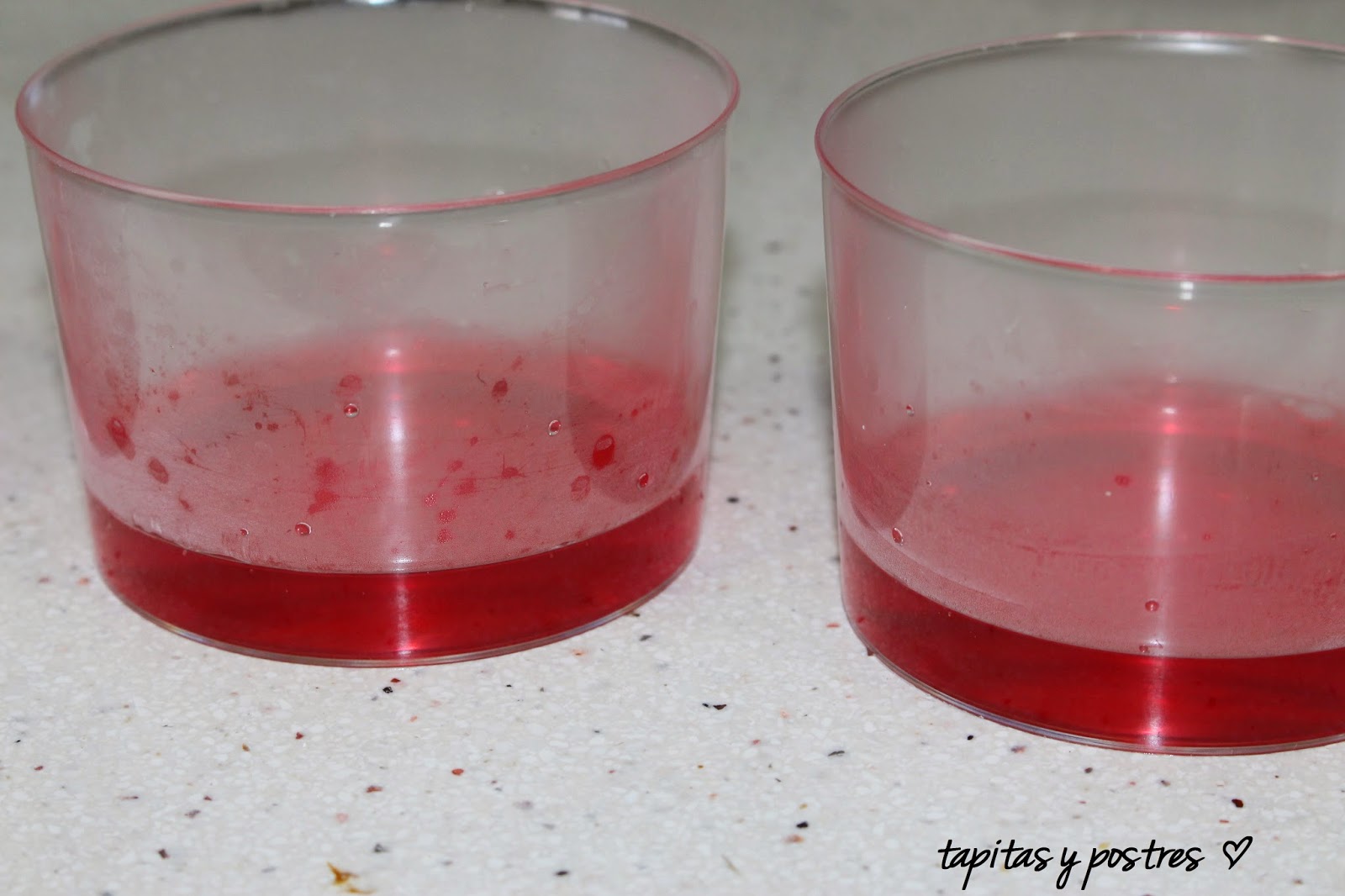 Vertemos un poco de gelatina de fresa en el recipiente elegido. Yo he usado estos vasitos de degustación, tienen el tamaño ideal para un postre como este. hay que dejar que cuaje unas horas.