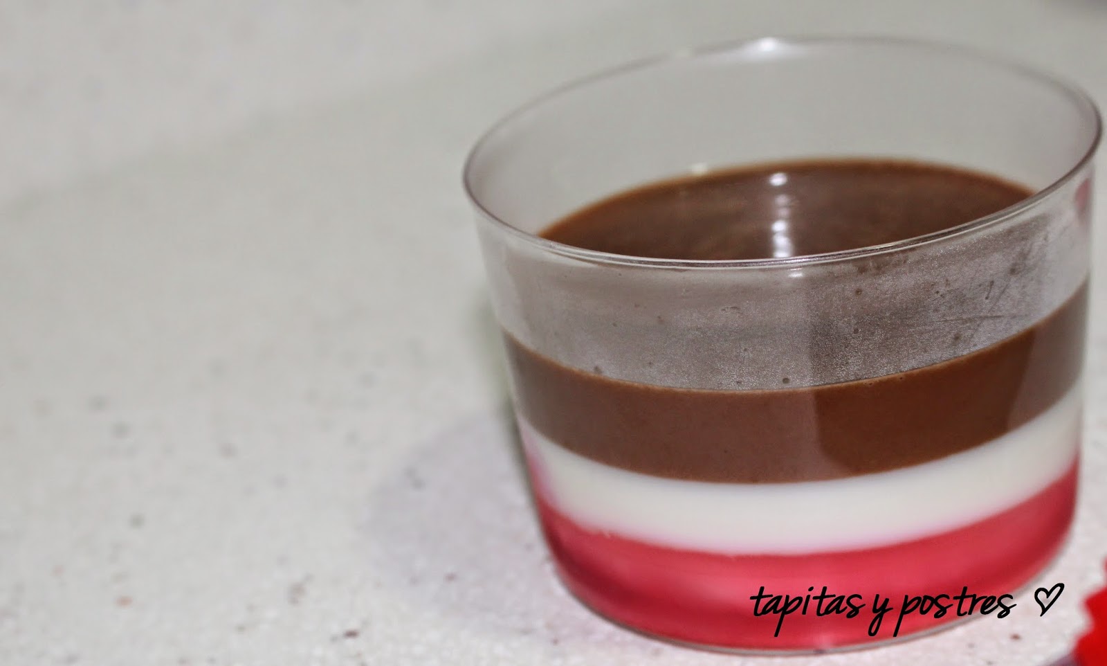 Y vertemos sobre el vasito la última capa. A pesar de que parece entretenido, este postre se prepara fácilmente. Yo hice la gelatina de fresa por la mañana, a media día, preparé la capa blanca y a última hora de la tarde hice la de chocolate. Listos para servir al día siguiente.