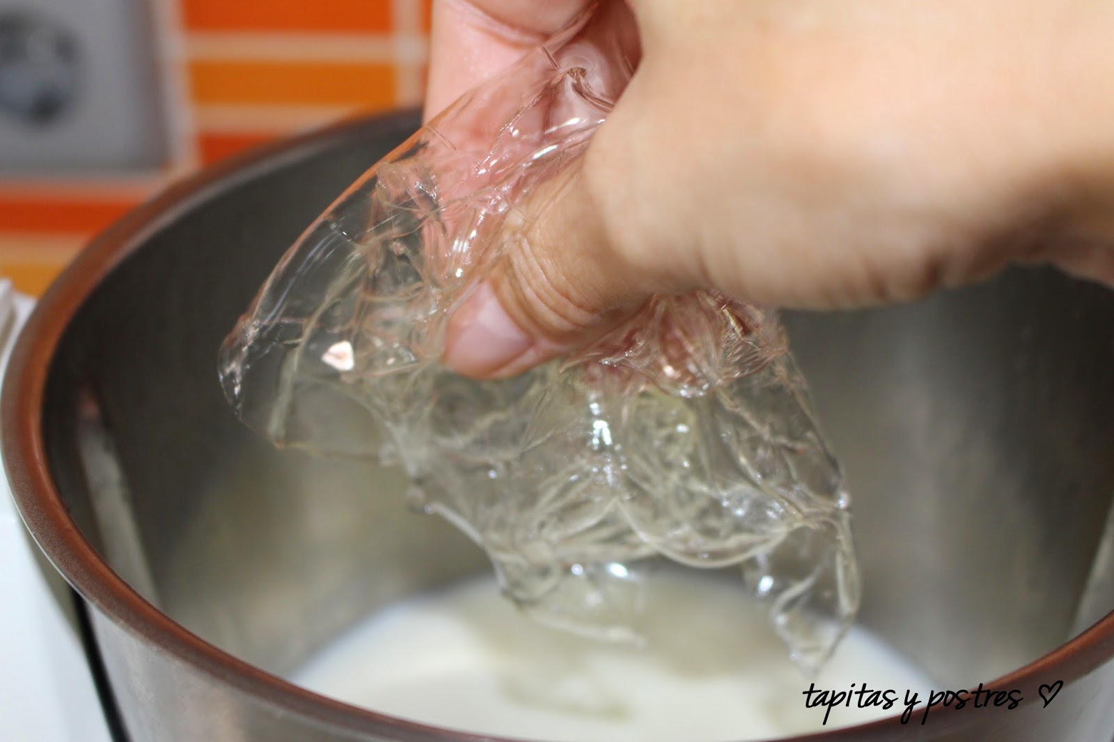 En el vaso de la thermomix ponemos la leche, la nata (crema de leche) y el azúcar y calentamos 10 minutos, 90º, velocidad 1. Mientras se hace dejamos hidratando en agua fría las tres hojas de gelatina neutra.