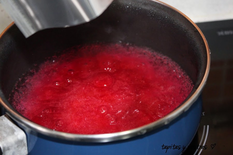 Cuando se haya cocinado unos diez minutos, añadimos las hojas de gelatina previamente hidratadas y escurridas. Removemos para que se integre bien. Echamos un poco de esta mezcla sobre el vasito donde teníamos la gelatina de fresa, pero aseguraros bien de que está cuajada. De esta parte se me pasó hacer la foto.