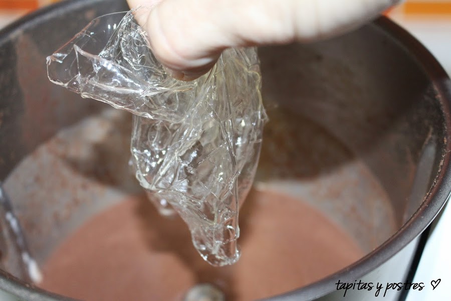 Mientras hidratamos las hojas de gelatina y cuando acabe de cocinarse la panna cota de chocolate la añadimos y mezclamos 1 minuto a velocidad 3.