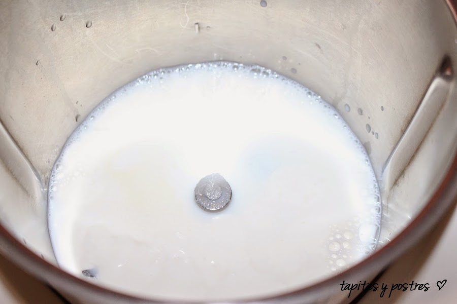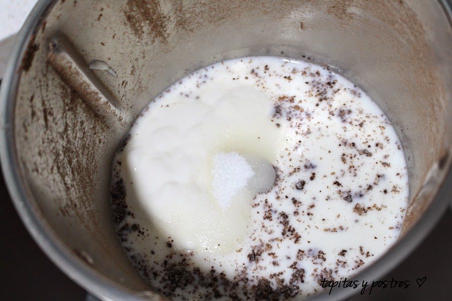 Agregamos la nata (crema de leche), leche y azúcar y calentamos 10 minutos, 90º, velocidad 1.