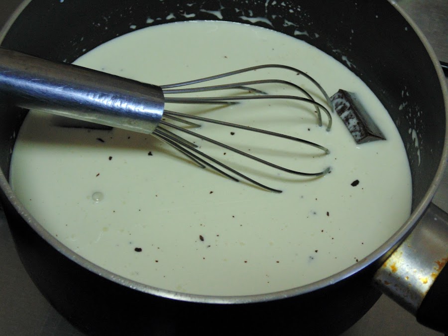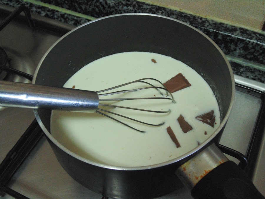 En un cazo vertemos 200 gramos de nata (crema de leche), 100 de leche y 50 de azúcar. Le añadimos los 100 gramos de chocolate negro. Vamos removiendo hasta que quede homogéneo y apartamos antes que comience a hervir. Añadimos luego las hojas de gelatina bien exprimidas. Removemos bien.