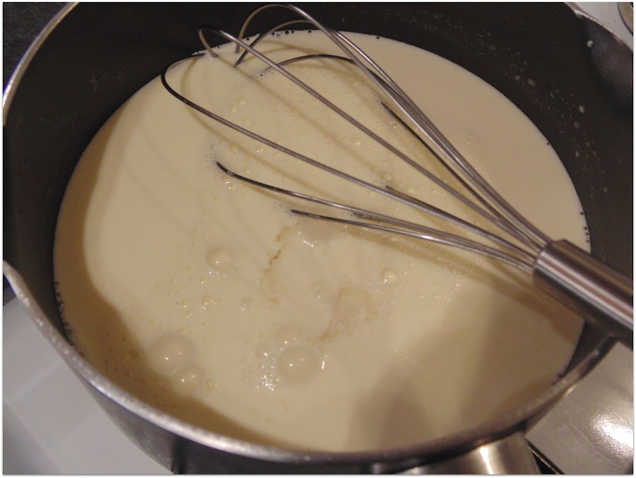 Vertemos en el cazo la nata (crema de leche), con la leche y el azúcar. Ponemos a calentar a fuego medio/lento. Agregamos la cucharadita de vainilla.
