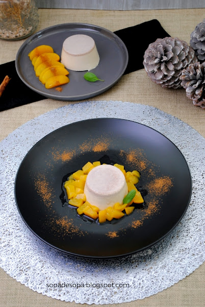 Poner la pannacotta en los platos de servir acompañada con el melocotón y rociado con su propio almíbar. Espolvorear con canela en polvo si gusta.