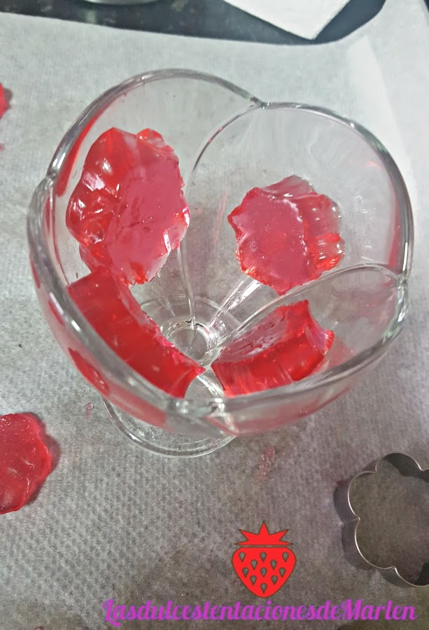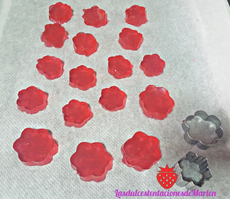 Con la ayuda de cortadores de galletas o similar haremos flores o cualquier otra forma que os guste. Los pegaremos delicadamente en las paredes interiores de las copas o vasos. ( ya veréis que la gelatina se queda pegada)