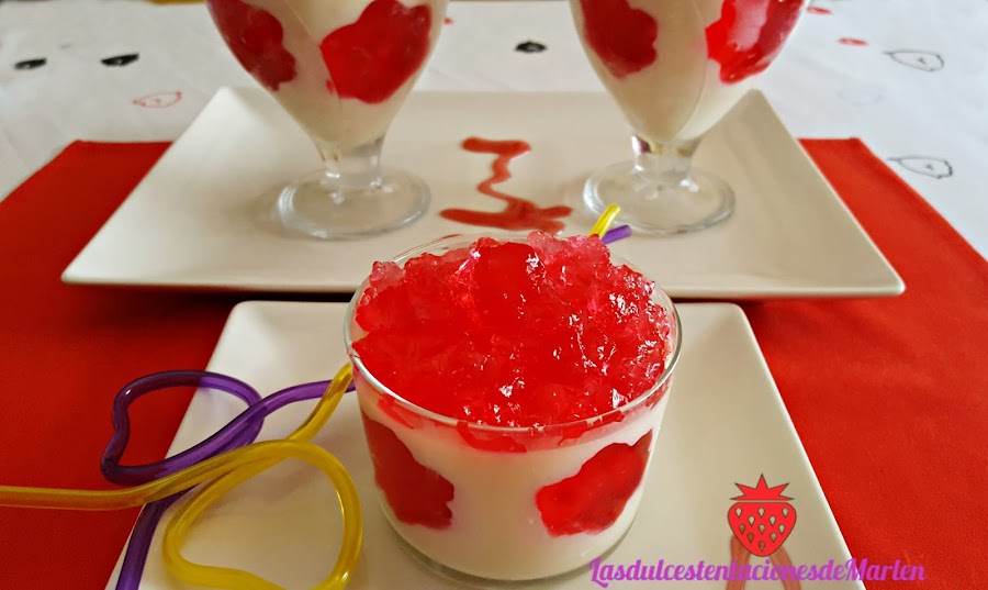 Rellenaremos los vasos con la crema de panna cotta templada con mucho cuidado. Si la crema está aun demasiado caliente se corre el riesgo de que los corazones se derritan. Hay que echarle un poquito de paciencia!!!