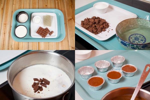 Empieza hidratando la gelatina. Para ello pon agua fría en un bol y sumerge las hojas de gelatina. Aparte, con un cuchillo trocea el chocolate en pedacitos muy pequeños (¡ojo que pueden salir volando!).