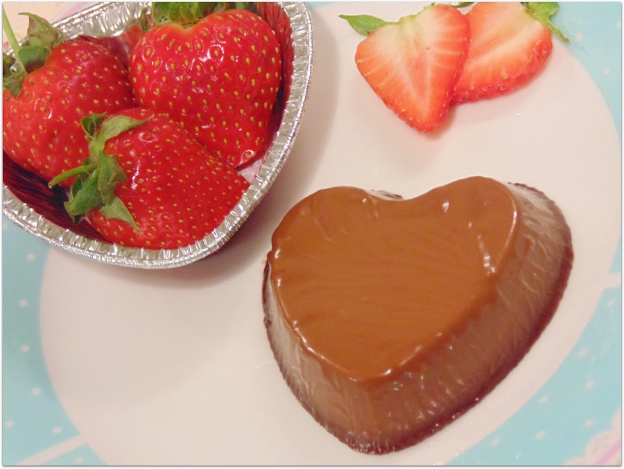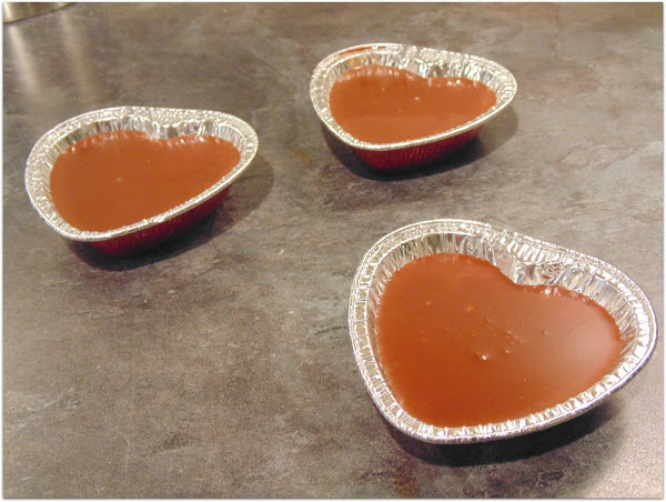Vertemos en nuestros recipientes. Yo utilicé unos moldes de aluminio de corazón ^^Dejamos reposar hasta que estén a temperatura ambiente e introducimos a la nevera al menos 4 horas antes del consumo.