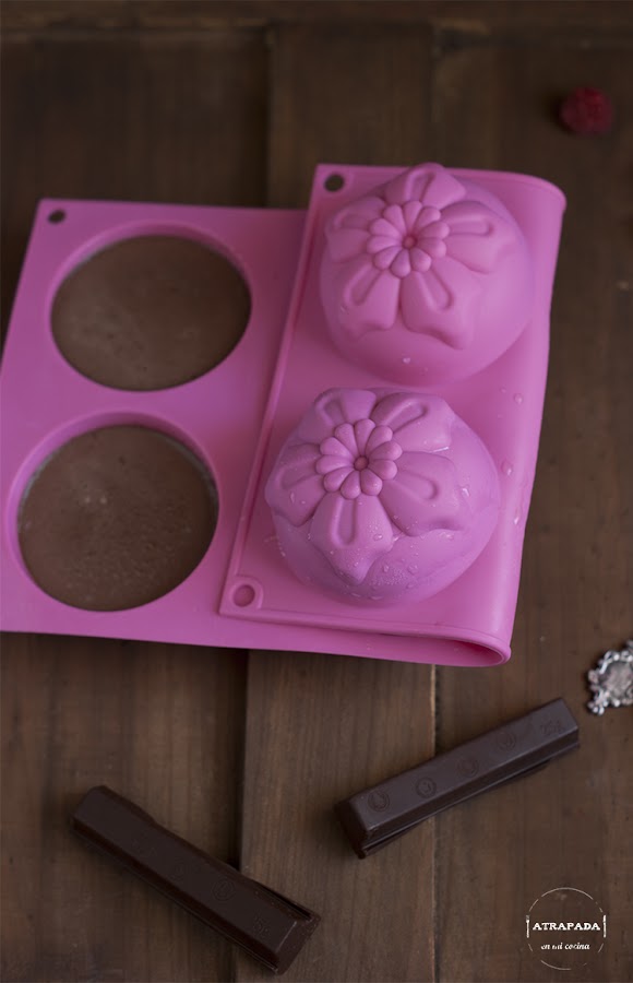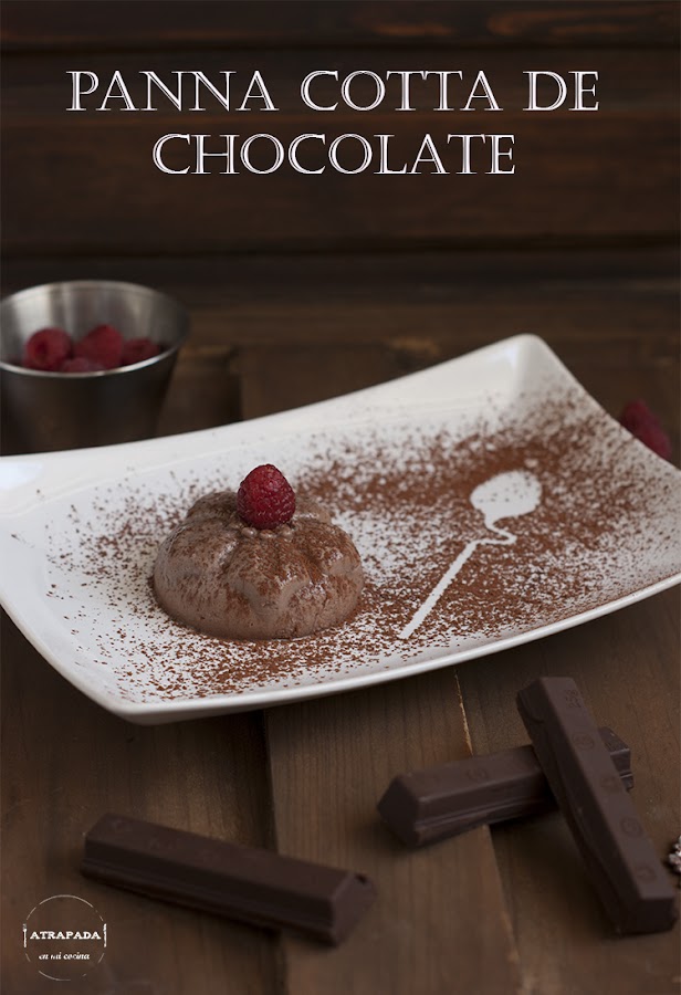 Sacamos las hojas de gelatina del bol, que ya estarán blanditas, y las estrujamos con las manos para quitar todo el agua posible. Añadimos la gelatina al cazo y removemos hasta disolver. Vertemos la mezcla en los moldes que hayamos elegido. Esperaremos a que enfríe a temperatura ambiente y lo meteremos en la nevera en cuanto sea posible para que enfríe por completo. Ésto nos llevará unas horas. A la hora de desmoldar lo haremos pasando el mango de una cucharilla con delicadeza por los extremos del molde, hasta que veamos que se despega con facilidad, ponemos al revés el molde y desmoldamos (también podemos introducir en el congelador una media hora antes de servir, para desmoldar con más facilidad). Servimos acompañado de unas frambuesas frescas y espolvoreamos un poco de cacao en polvo.