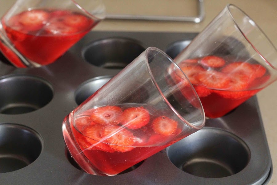 Dividimos esta gelatina en varios vasos y le ponemos unas rodajas de fresas, las mezclamos un poco y dejamos los vasos inclinados 45º en algún sitio que se mantengan en esa posición al menos 1 hora que cuajen bien.(mirad la foto a continuación).