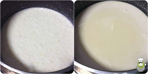 Mientras preparamos la gelatina, calentamos en un cazo a fuego medio la nata (crema de leche) con el azúcar. Removemos bien hasta que el azúcar se disuelva. Tenemos que estar atentos a que la nata (crema de leche) no hierva así que si vemos que se acerca al punto de ebullición, bajamos el fuego. Añadimos el licor café (cuanto más dulce y suave sea el licor, mejor será el resultado final y menos se notará el alcohol así que si podéis haceros con un buen licor casero mejor que uno comercial, no os lo penséis dos veces).