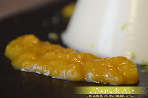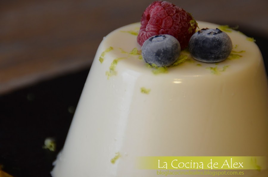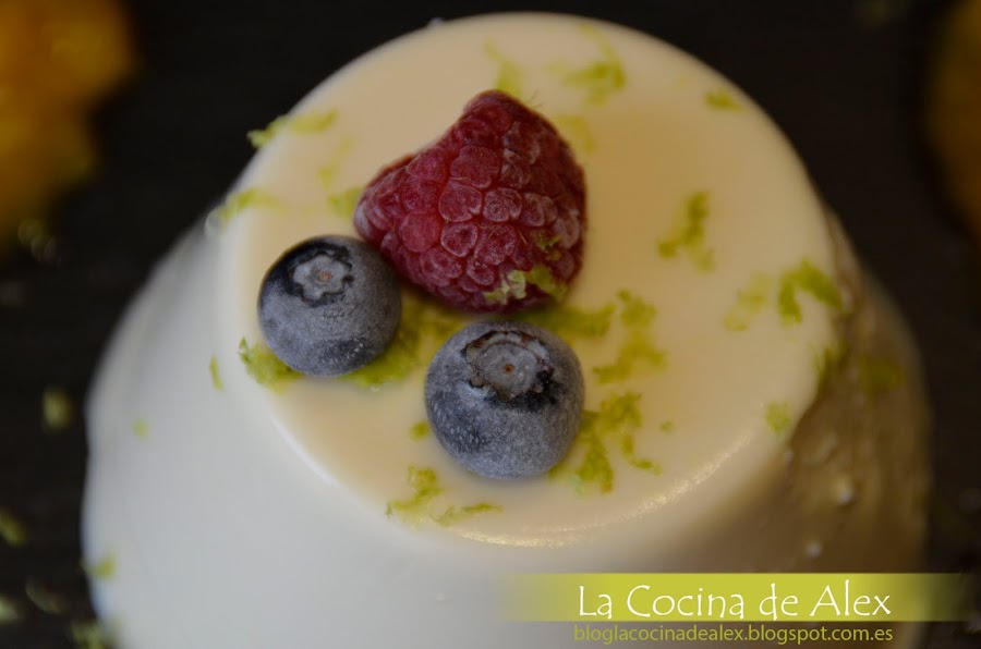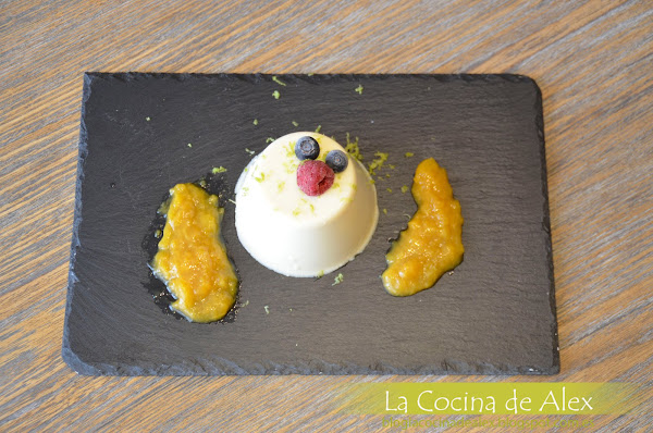 Para la presentación final, desmoldamos la panna cotta ayudándonos con la ayuda de un cuchillo o metiendo el molde unos segundo es agua caliente, rallamos un poco de piel de limón y acompañamos con el coulis de melocotón y unos frutos rojos.