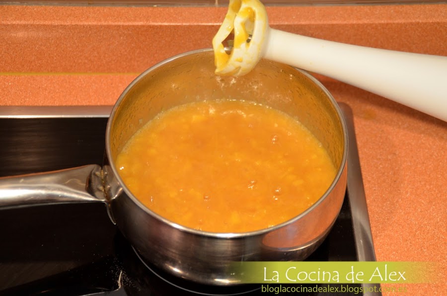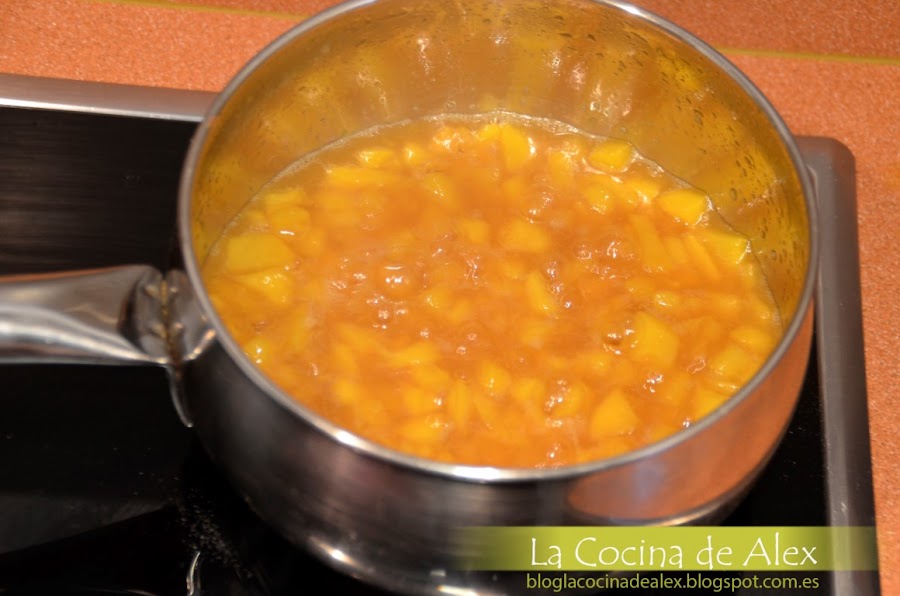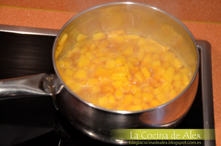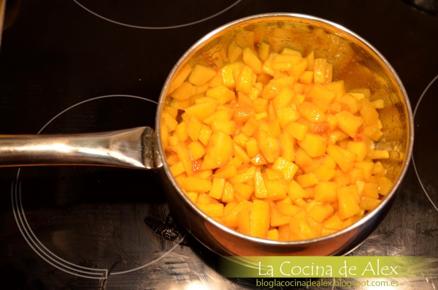 Para hacer el coulis ponemos la mezcla anterior, que habrá soltado bastante líquido, al fuego medio-bajo durante 15-20 minutos removiendo de vez en cuando para que el azúcar no se pegue al fondo. Cuando veamos que el melocotón esta tierno lo batimos y tendriamos listo este rico coulis. Yo no lo paso mucho porque me gusta encontrarme los trozos de fruta pero vosotros lo podéis dejar lo fino que más os guste, incluso pasarlo por un chino. Dejamos enfriar en el frigorífico durante mínimo 3-4 horas pero os recomiendo comerla al día siguiente que estar mucho más rica.