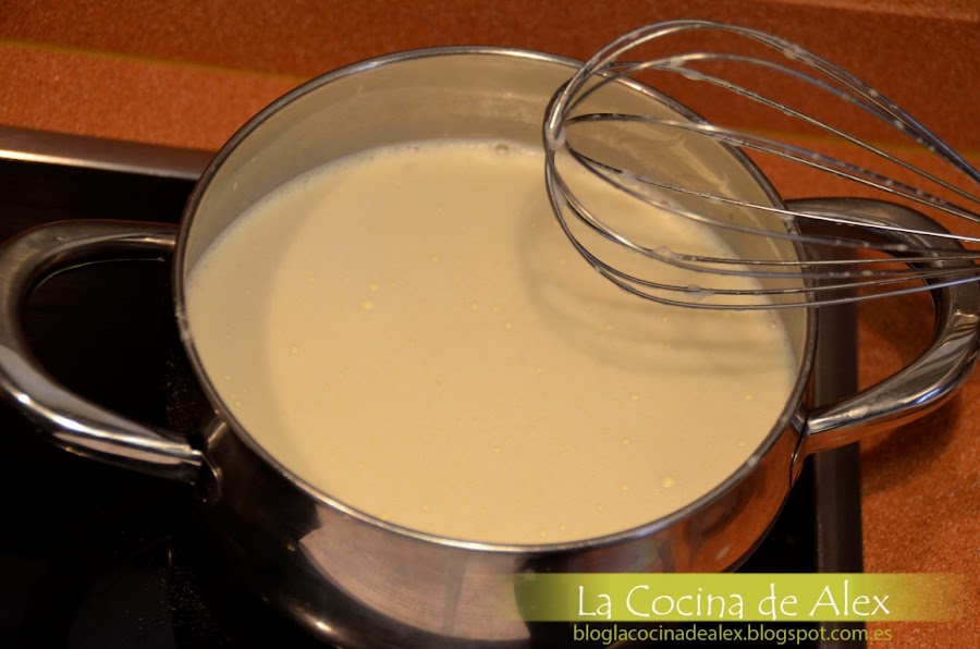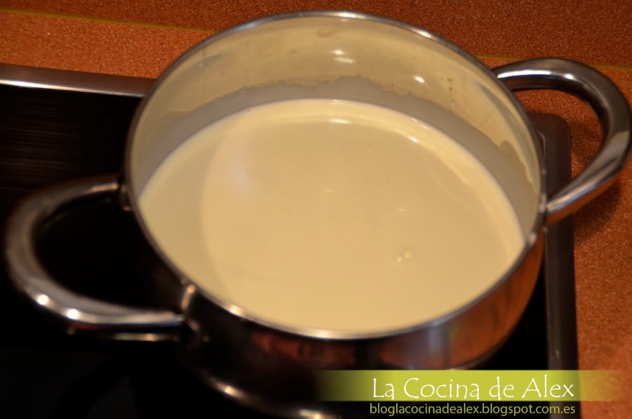 A continuación ponemos en un cazo la nata (crema de leche) a calentar, lo calentamos un poco y añadimos el azúcar, la esencia de vainilla, la leche y el queso crema siempre teniendo en cuenta que no tiene que hervir y sin dejar de remover con las varillas.