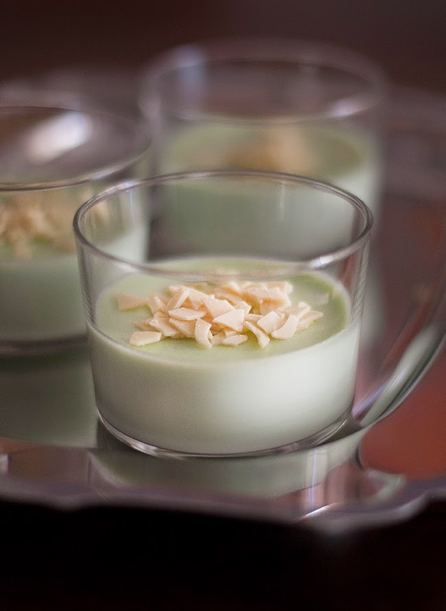 Colar i afegir la gelatina ben escorreguda, aprofitant la calor de la preparació i removem fins a la seva completa dissolució. Repartir en quatre gotets i deixar refredar completament abans de ficar-los en la nevera perquè qualli del tot la gelatina (com a mínim unes 4 hores). Jo vaig empolvorar cada gotet de ratlladura de xocolata blanca.