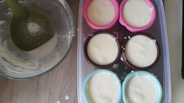 Repartimos en vasitos tamaño flan de silicona y dejamos enfriar en la nevera mínimo 6h, pero mejor si se prepara de un día para otro.