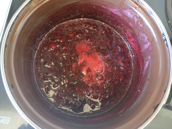 Para el coulis, o salsa de frutos rojos, simplemente ponemos a calentar en el fuego un puñado de frutos rojos, pueden ser congelados, durante 30-40 min.