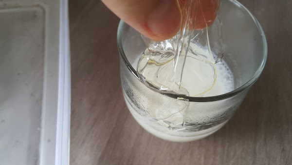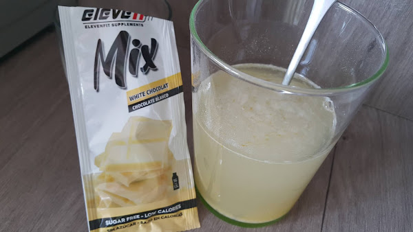 Rellenamos el vaso hasta completar unos 250 ml con agua y removemos bien. Agregamos el sobre de saborizante de chocolate blanco y removemos hasta que se disuelva.