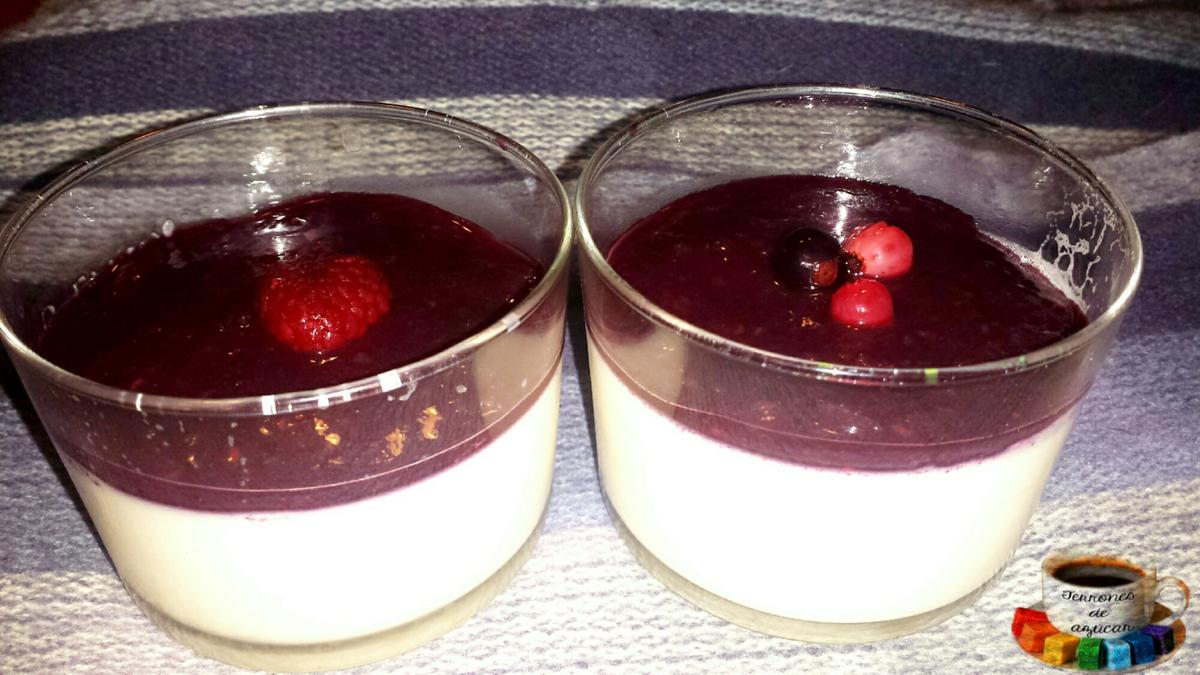 A la hora de servir es típico acompañarla con mermelada de fruta frescas o alguna salsa dulce. Yo he aprovechado unos pocos frutos del bosque congelados (con arándanos, moras, frambuesas, etc.) que me quedaban para preparar un culís. Simplemente he puesto en un cazo pequeño la fruta congelada (en mi caso unos 100 gr) junto a 50 ml de agua y un poco de sacarina líquida. He dejado que se vaya reduciendo y por último lo he pasado por la batidora para dejarlo bien fino. Puedes presentar la Panna Cotta de varias maneras: en un plato (a modo de flan) con el culís por encima como re muestro:
