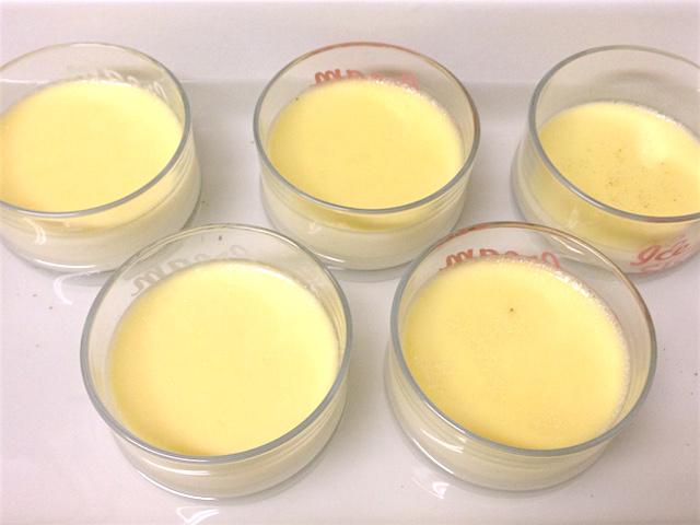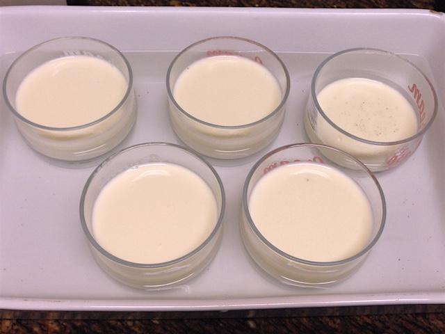 Calentar el horno a 130ºC y preparar una fuente con agua caliente para el baño María, que cubra 3/4 partes de los vasitos. Hornear durante 1 hora hasta que cuajen, el centro quizá quede un poco blandito o tembloroso como una cheesecake, no importa. Apagad el horno y dejar el horno entreabierto. Sacad la fuente con el baño y los vasitos y dejar que se enfríe por completo. Una vez fríos los vasitos refrigerar en nevera toda una noche. A la hora de servirla sacad un poquito antes de la nevera. Simplemente deliciosa y con muy pocos ingredientes.