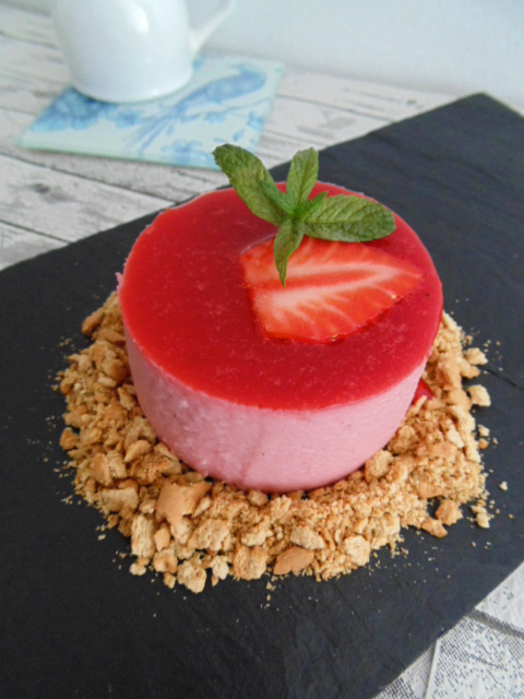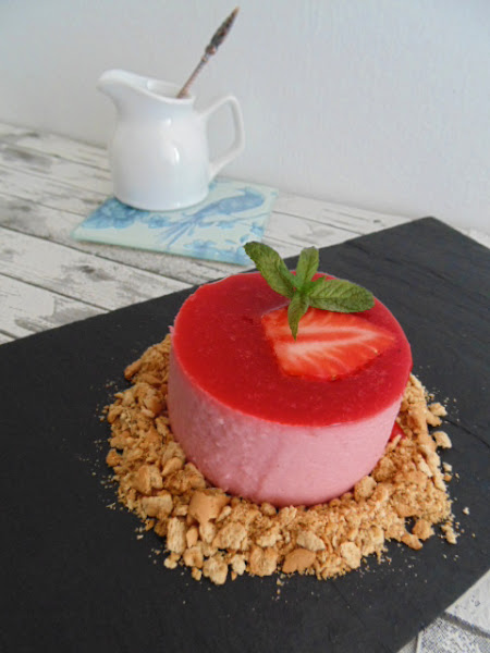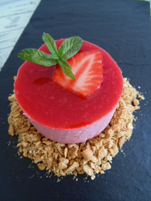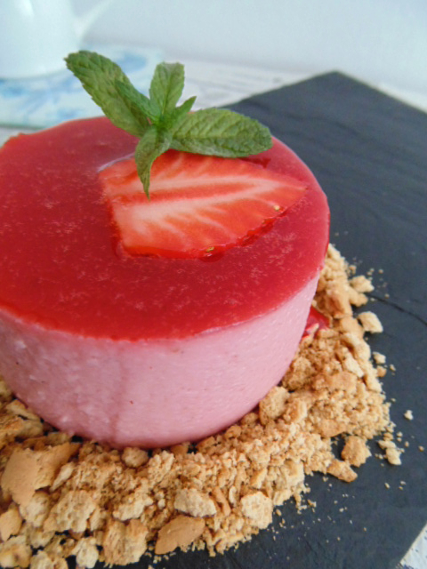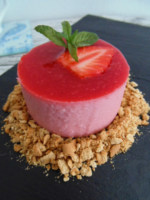 Una vez pasadas las 5 horas, desmoldamos y para servir, pondremos nuestra panna cotta sobre la tierra de galletas y decoramos con el coulis, láminas de fresas y la hierbabuena.