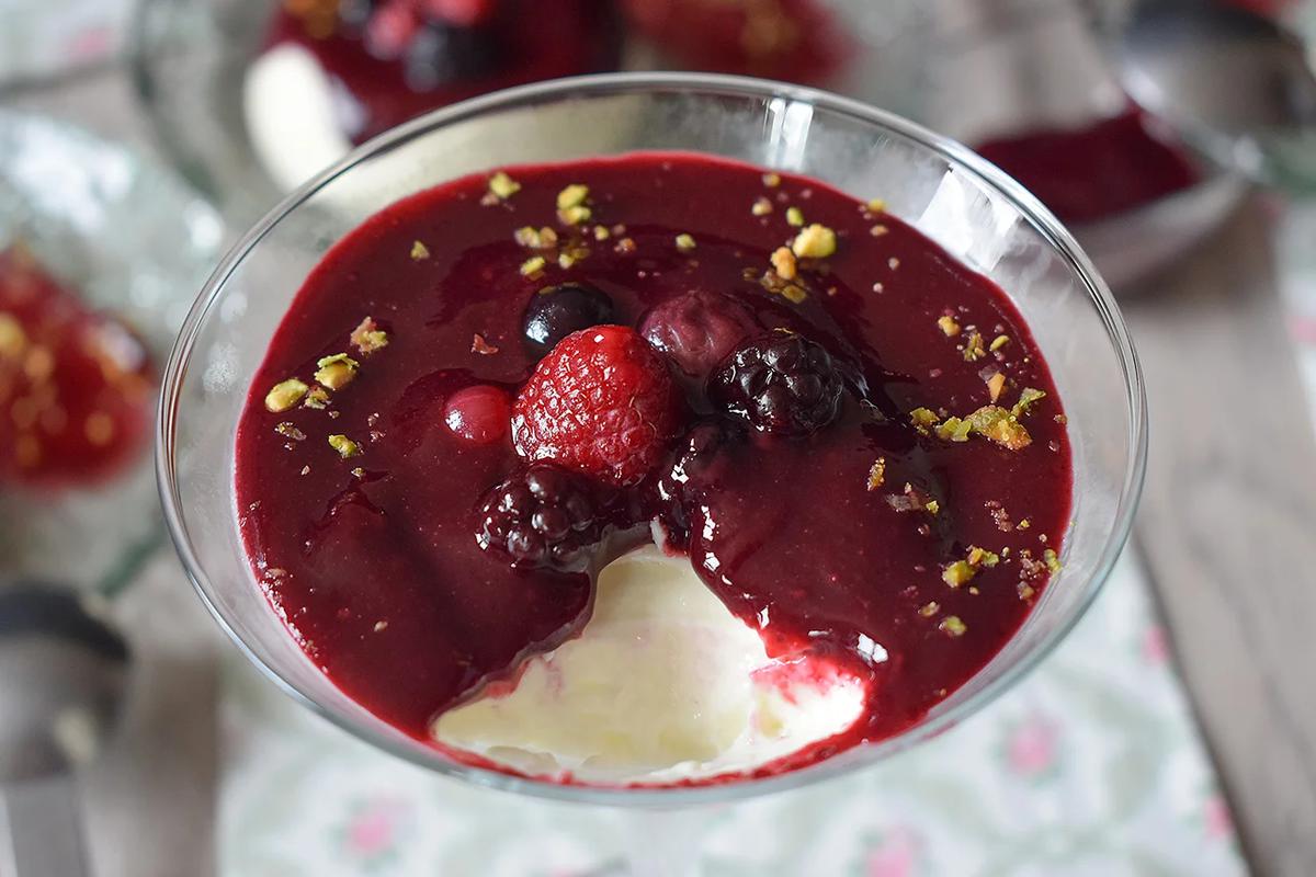 La que ves en la imagen está acompañada de coulis de frutos rojos, desde luego a mi es la combinación que más me gusta!